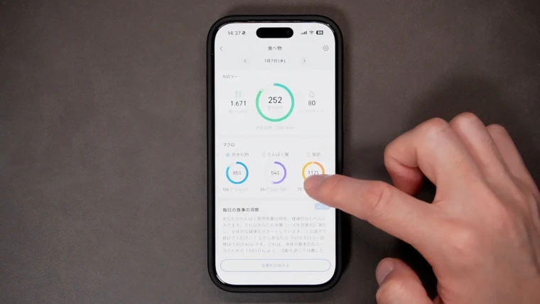 また、AI食事管理 (Food Log機能)も結構スゴくて、スマホで食事の写真を撮るだけで、AIが画像を解析してカロリーや栄養素を自動記録。