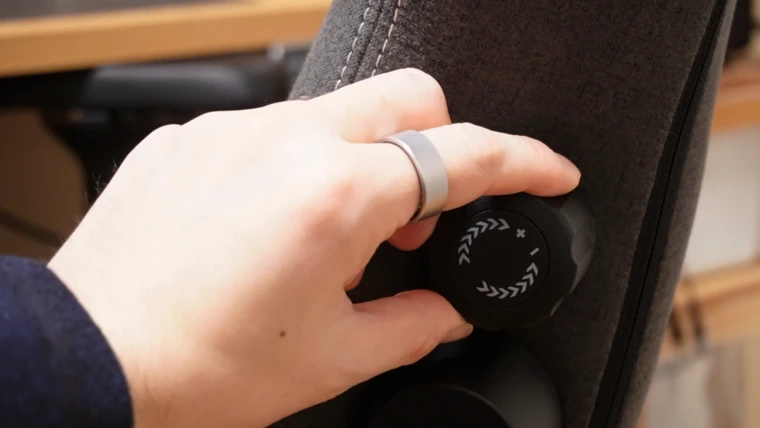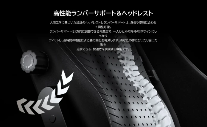 左右の側面に搭載されたダイヤルを回すことで、内蔵型のランバーサポートが上下・前後の4方向に稼働。背骨のラインにぴったりフィットさせながら座ることができます。