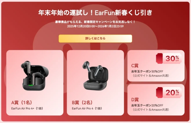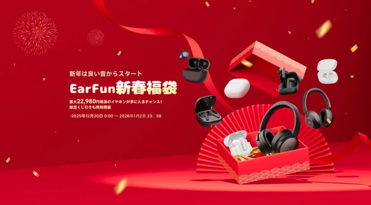 現在EarFunでは、3年ぶりの開催となる「最大22,980円相当」が1万円ちょっとで手に入る新春福袋を発売中です。