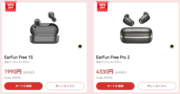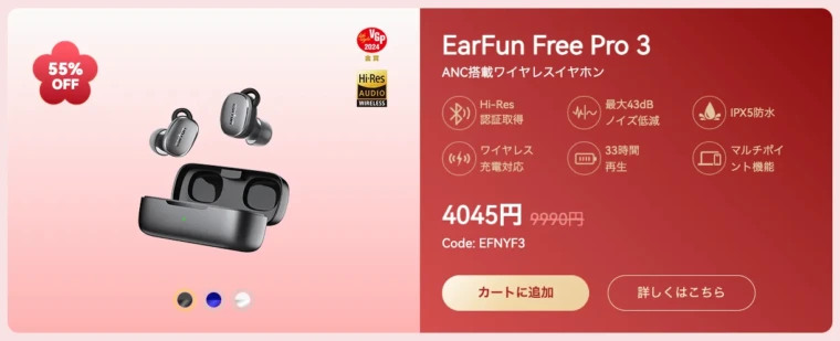 例えば、EarFun Free Pro 3が割引コード「EFNYF3」の適用でなんと4,045円!(通常9,990円)