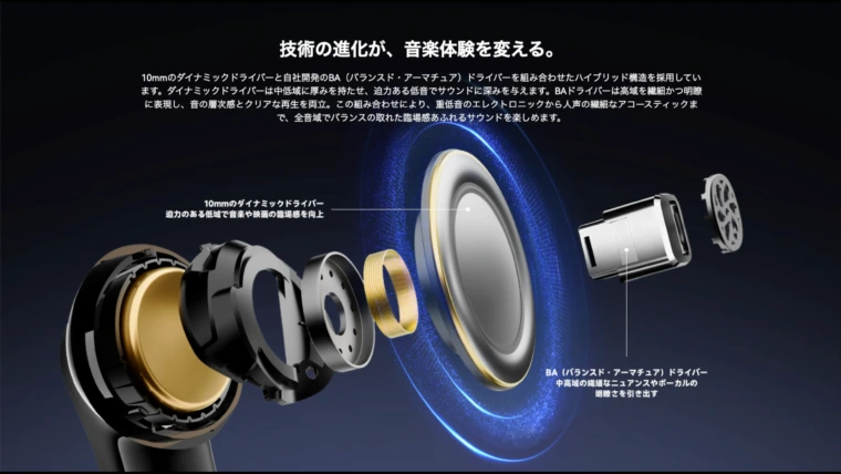 ドライバーには、10mmダイナミックドライバーとEarFun自社開発のバランスド・アーマチュア(BA)ドライバーを組み合わせたハイブリッド構造を採用しています。