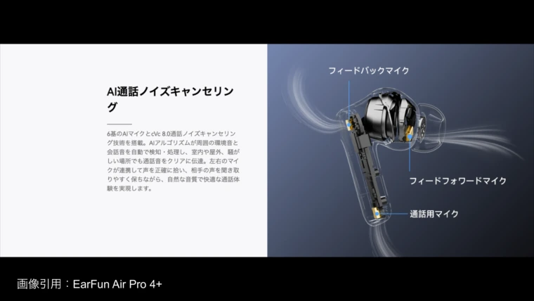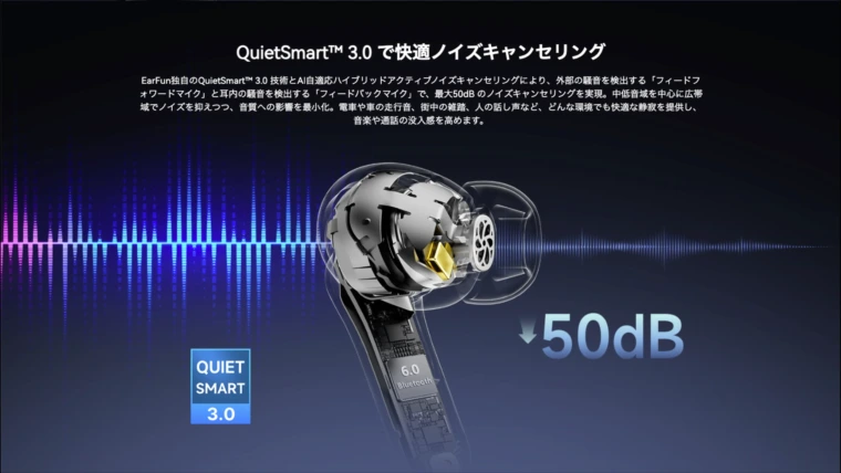 Air Pro 4+では、EarFun独自の「QuietSmart 3.0」ハイブリッドANC技術を搭載。