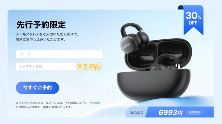 現在EarFun公式でEarFun Clip 2の先行予約がスタートしています。