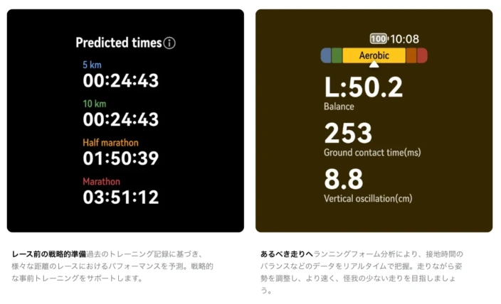左右の接地バランスや垂直振動などのデータをリアルタイムで検出してくれるため、効率の良いランニングやフォーム改善のアドバイスまで受けられる、非常に心強い機能です。
