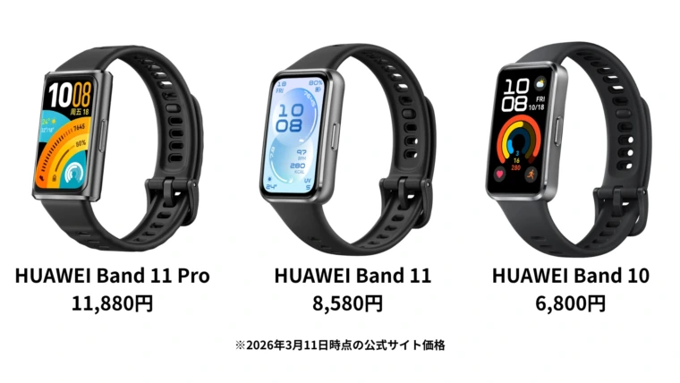 今回のBand 11シリーズは、通常ラインのBand 11とBand 11 Proの2つを展開。執筆時点では、Band 10も併売されています。(※2026/03/13時点)