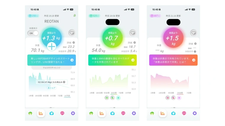 また、個々のプライバシーにも配慮しながら最大8人の家族と併用することができます。気軽に体の内外データを計測しながら、家族みんなで健康を見守れるのも魅力の一つだと言えますね。