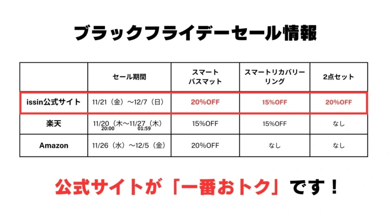 通常こうしたセールは、Amazonや楽天で購入する方がおトクな場合が多いのですが、今回のブラックフライデーセールに限っては「issinの公式サイトが一番おトク」になっています。