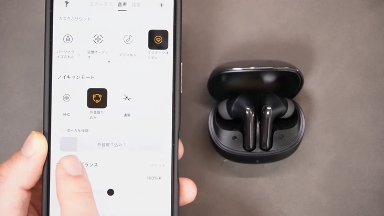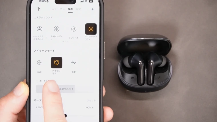 イヤホンをつけたままスムーズに会話できる「ボーカル強調モード」も利用できるので、この辺の使い勝手もかなり良い感じです。